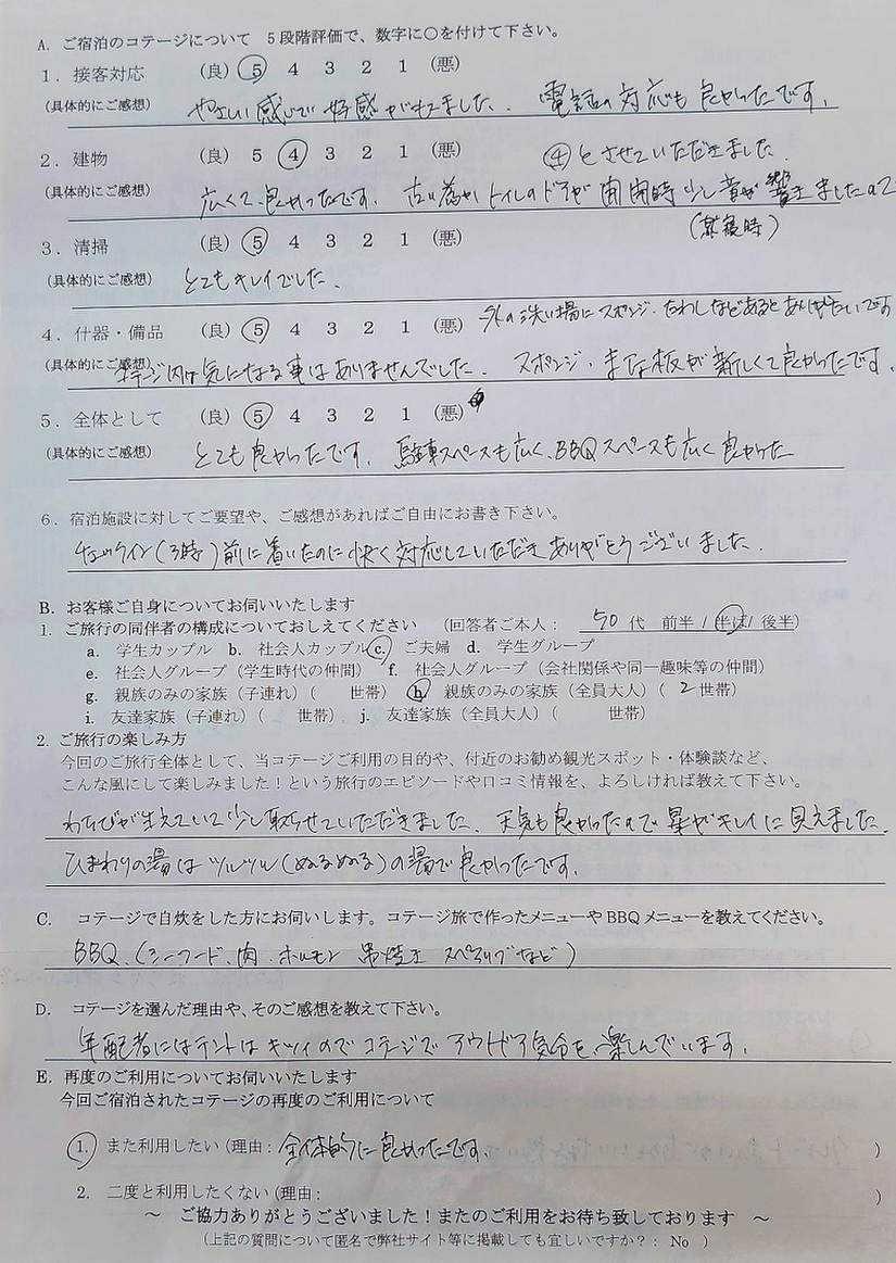 清掃もきれいで駐車スペースも広く、BBQスペースも広く良かった。